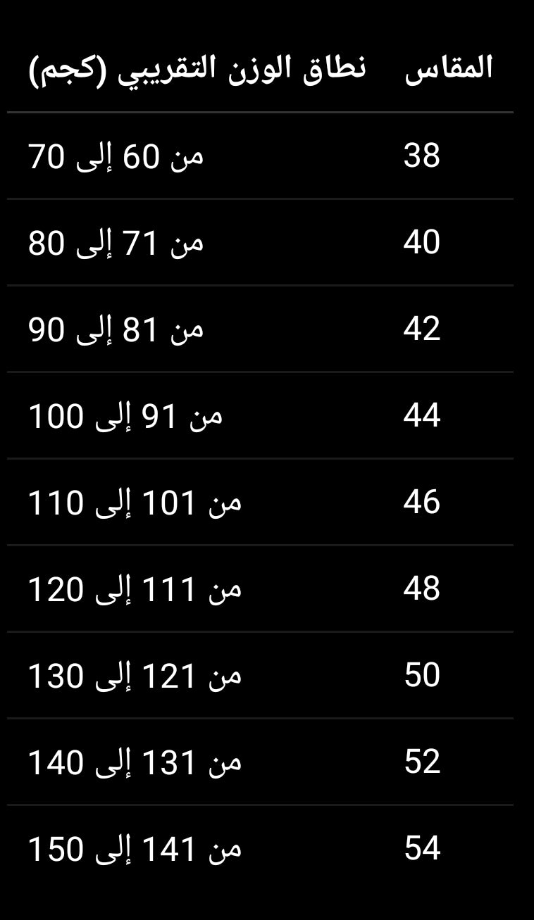 المقاسات موضحة بالكامل فى جدول المقاسات بالصور مناسبة لأوزان من 50 كجم حتى 150 كجم لضمان المقاس المثالى اختار مقاسك بناءا على الوزن فى جدول المقاسات.